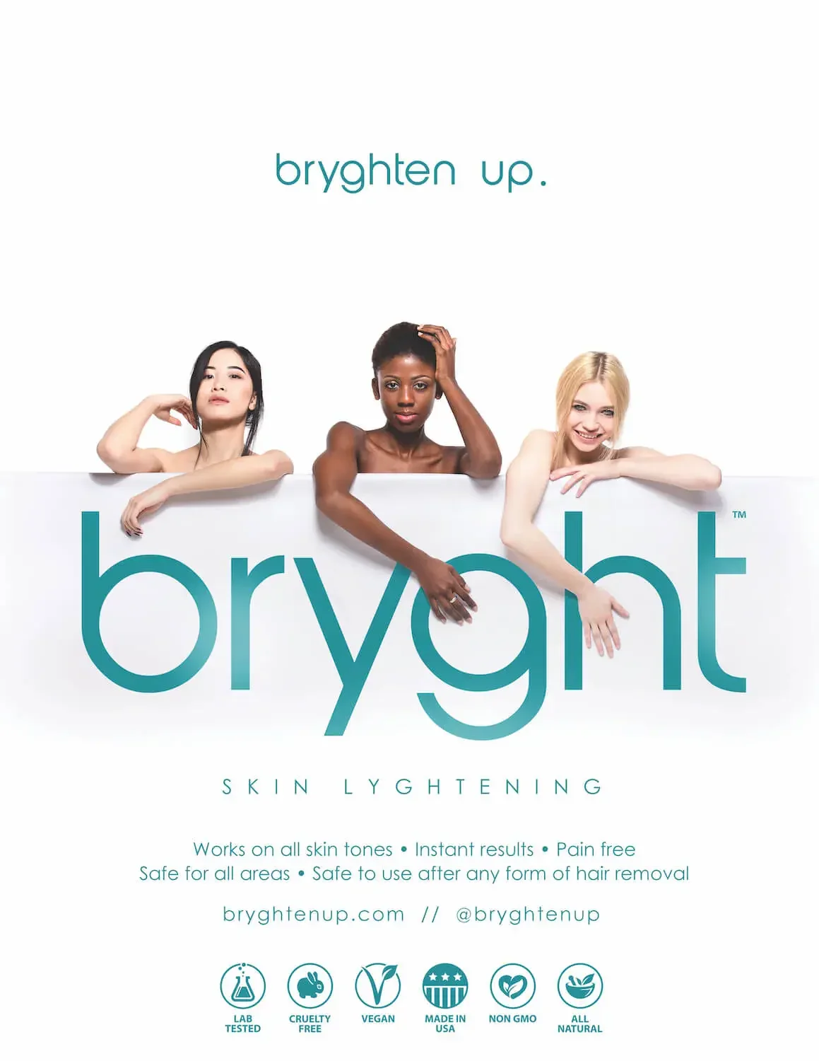 Bryghten Up is a skin lightening/brightening system designed to even out skin tone and reduce unwanted discoloration— safely, gently, and for all skin tones. It promises instant results, works on all skin types and areas, is pain-free, and safe to use after any form of hair removal. The product is lab-tested, cruelty-free, vegan, non-GMO, and all natural.